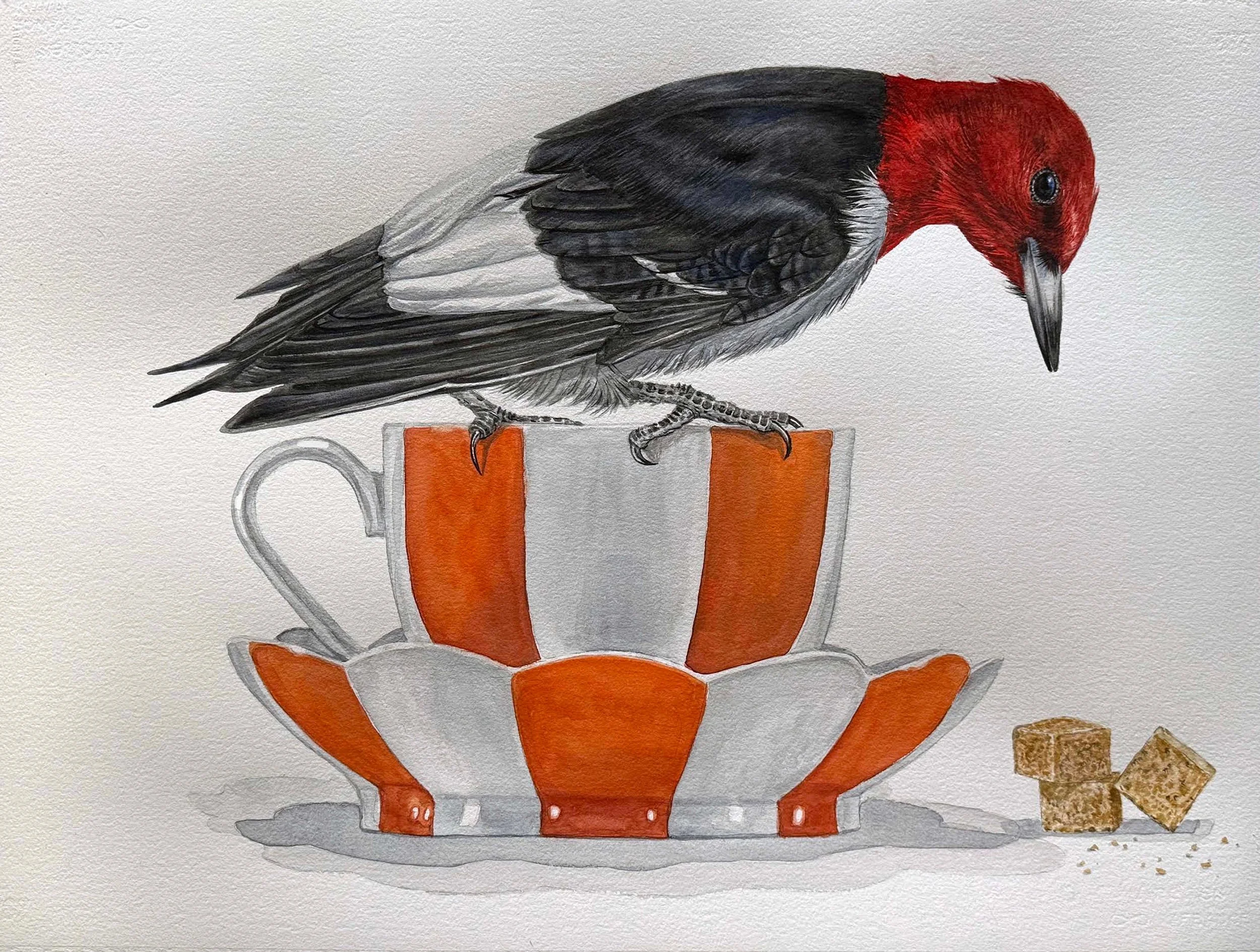 A simpler watercolor on paper features a red-headed woodpecker perched on a scalloped orange-and-white teacup. The bird gazes toward a few sugar cubes beside the cup, as if it has just knocked them over itself