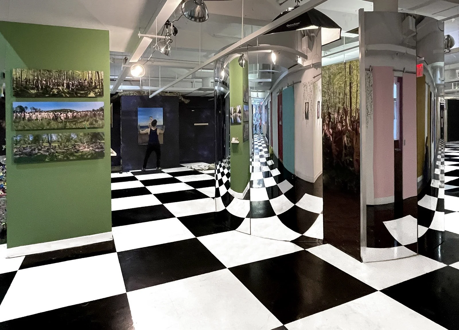 Outside the installation are 4 other panoramic photos of different settings in the happening made on the same day in Glen Wild, New York in June. In one people feed apples to each other in a lush garden of Eden. In another they stand masked in a field of tall grass—censored, or just reliving the past 2 years? Another one is a different take on the “mud party” in the forest. In the river scene the people stand waist high in a bucolic Upstate creek. These other panoramas are exhibited in a smaller flat traditional presentation in the show, but could eventually find their way in to the larger 8 foot cyclorama in the future.