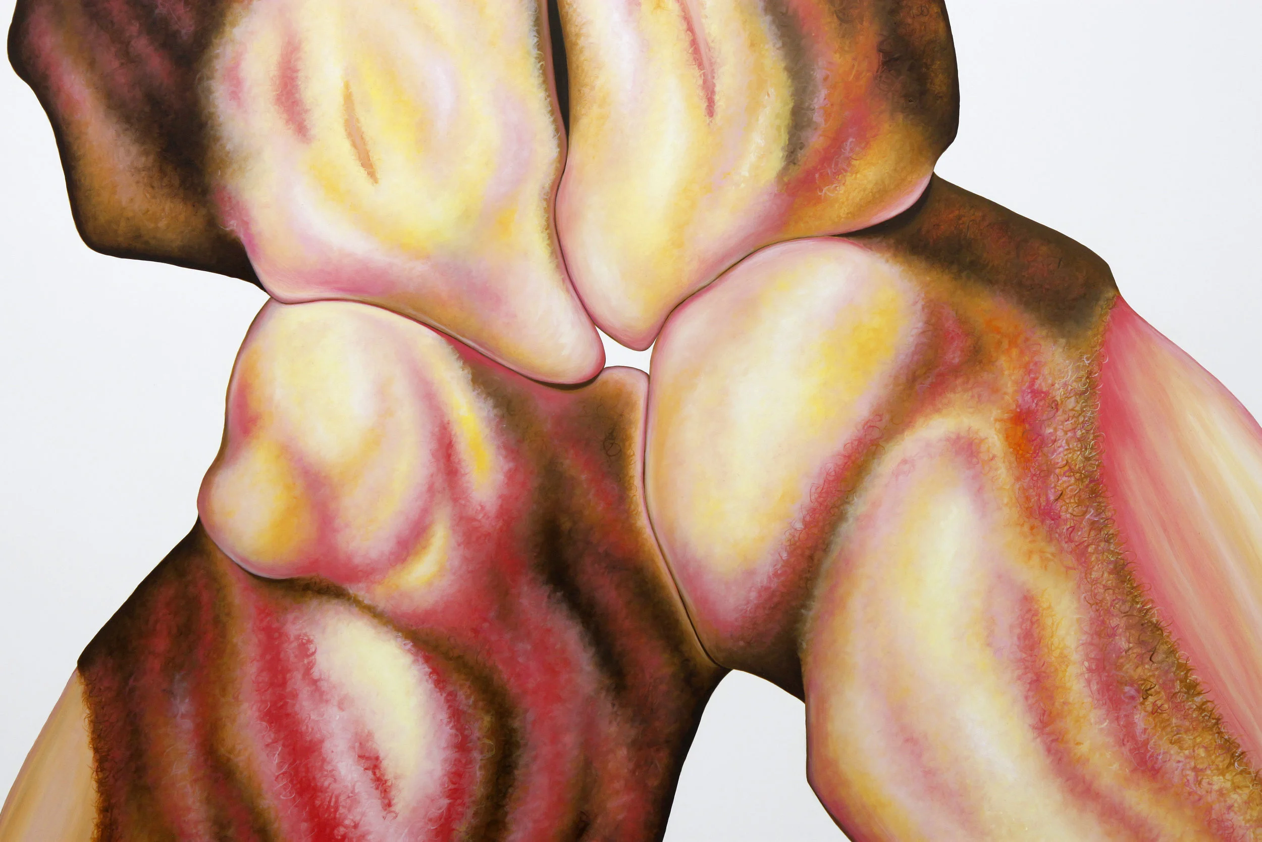 Beginning with observational drawing, Roz uses addition and omission to morph segmented botanical shapes into incongruous bodily juxtapositions. In browns, pinks and orange, the sexualized forms hover on a white gessoed background of negative space. Roz’s compositions exist in a void. The permutations are fluid and re-embodied to infer figuration. Loaded up with bulbous volume and lush texture, the incongruous shapes resemble flesh and muscle and bones. The intentionally charged ambiguity leaves the innuendo open to uninhibited interpretation.