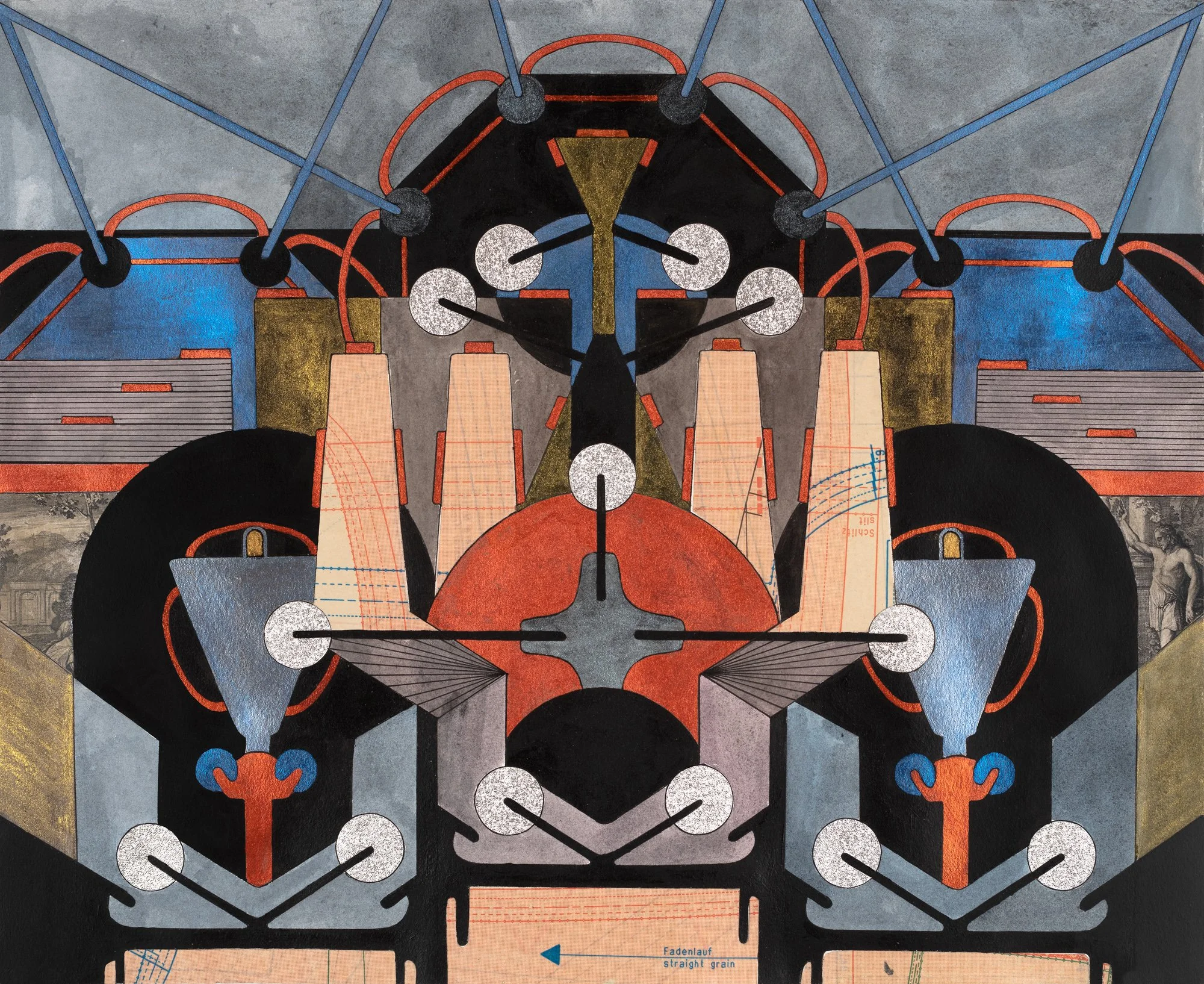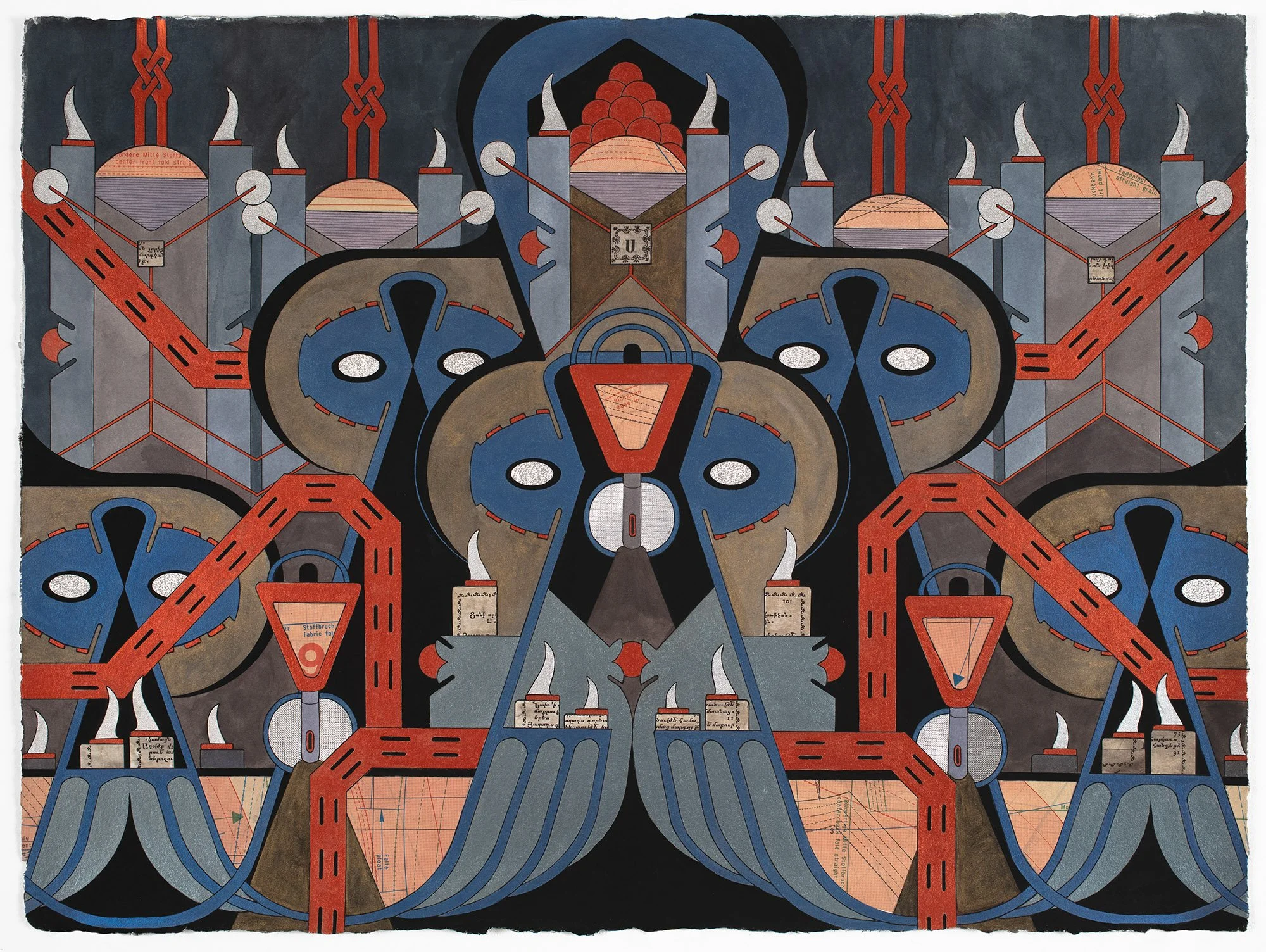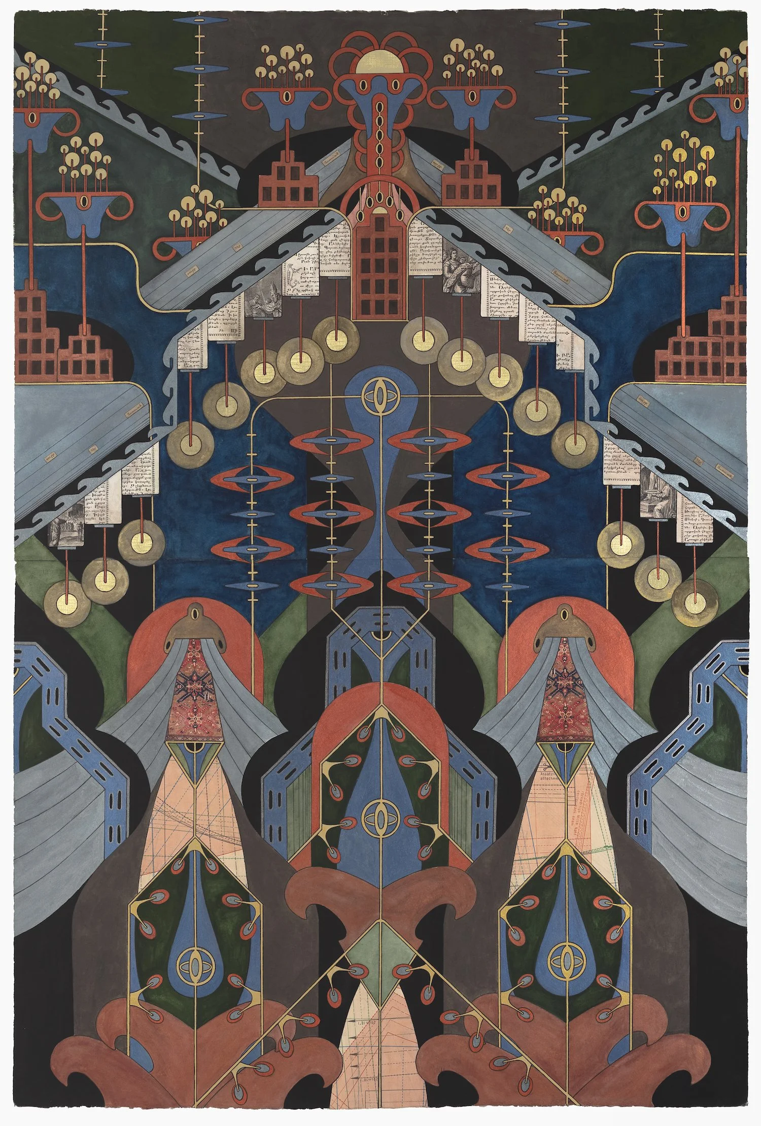 The compositions are dominated by mirrored structures suggestive of cathedral spires, circuitry, and ritual altars. Repetitive radial motifs and vaulted forms reference rose windows and sacred geometry, while the inclusion of photographic imagery and textured paper introduces elements of memory and cultural layering. Interlaced blue and red conduits traverse the piece like vascular or electrical systems.