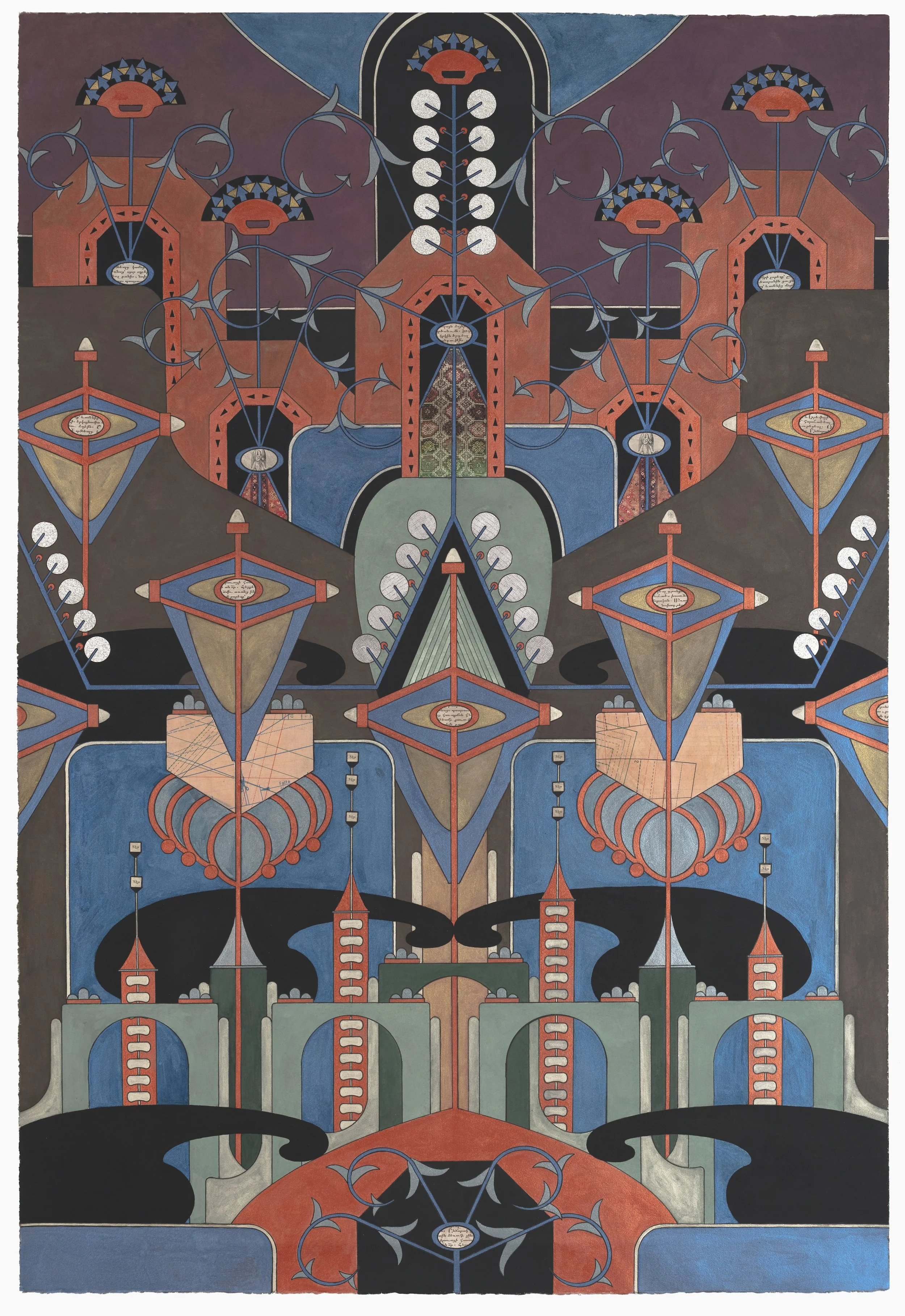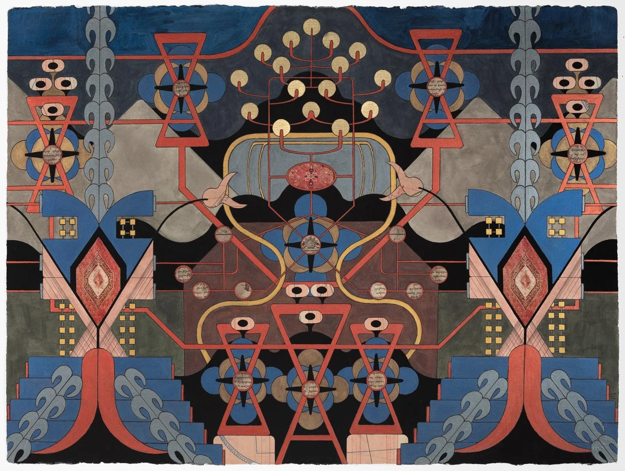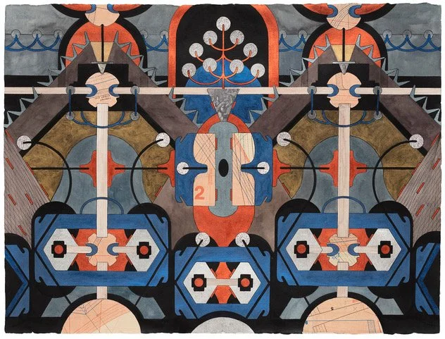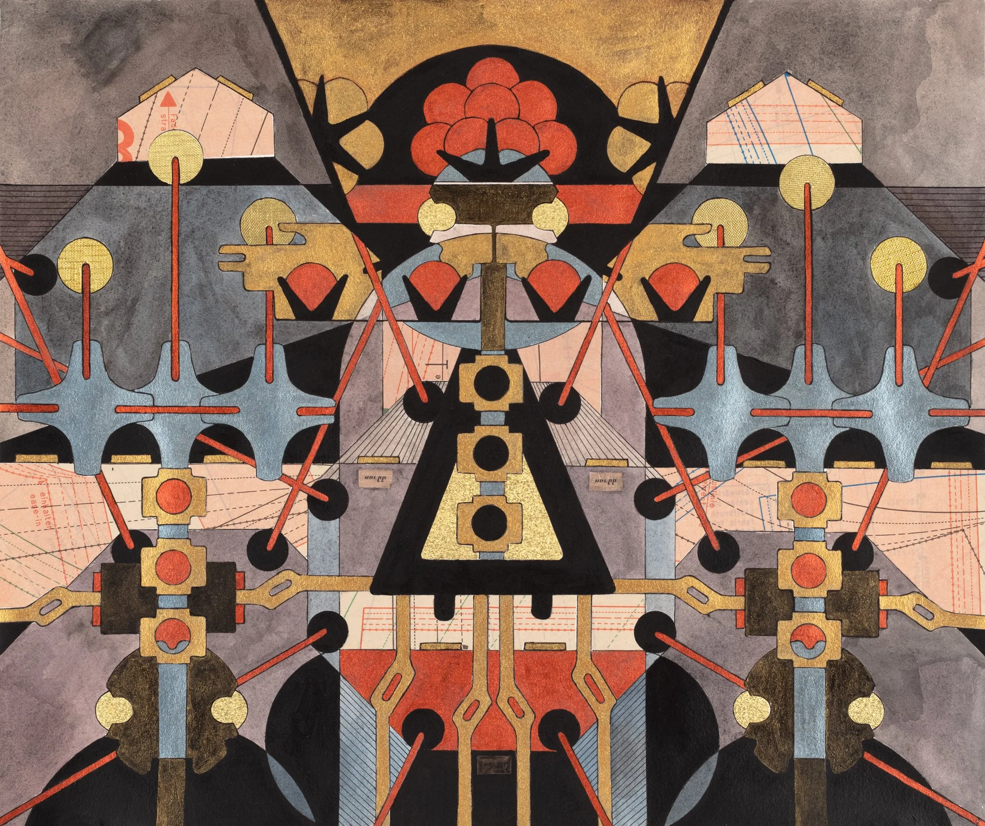 The compositions are dominated by mirrored structures suggestive of cathedral spires, circuitry, and ritual altars. Repetitive radial motifs and vaulted forms reference rose windows and sacred geometry, while the inclusion of photographic imagery and textured paper introduces elements of memory and cultural layering. Interlaced blue and red conduits traverse the piece like vascular or electrical systems.