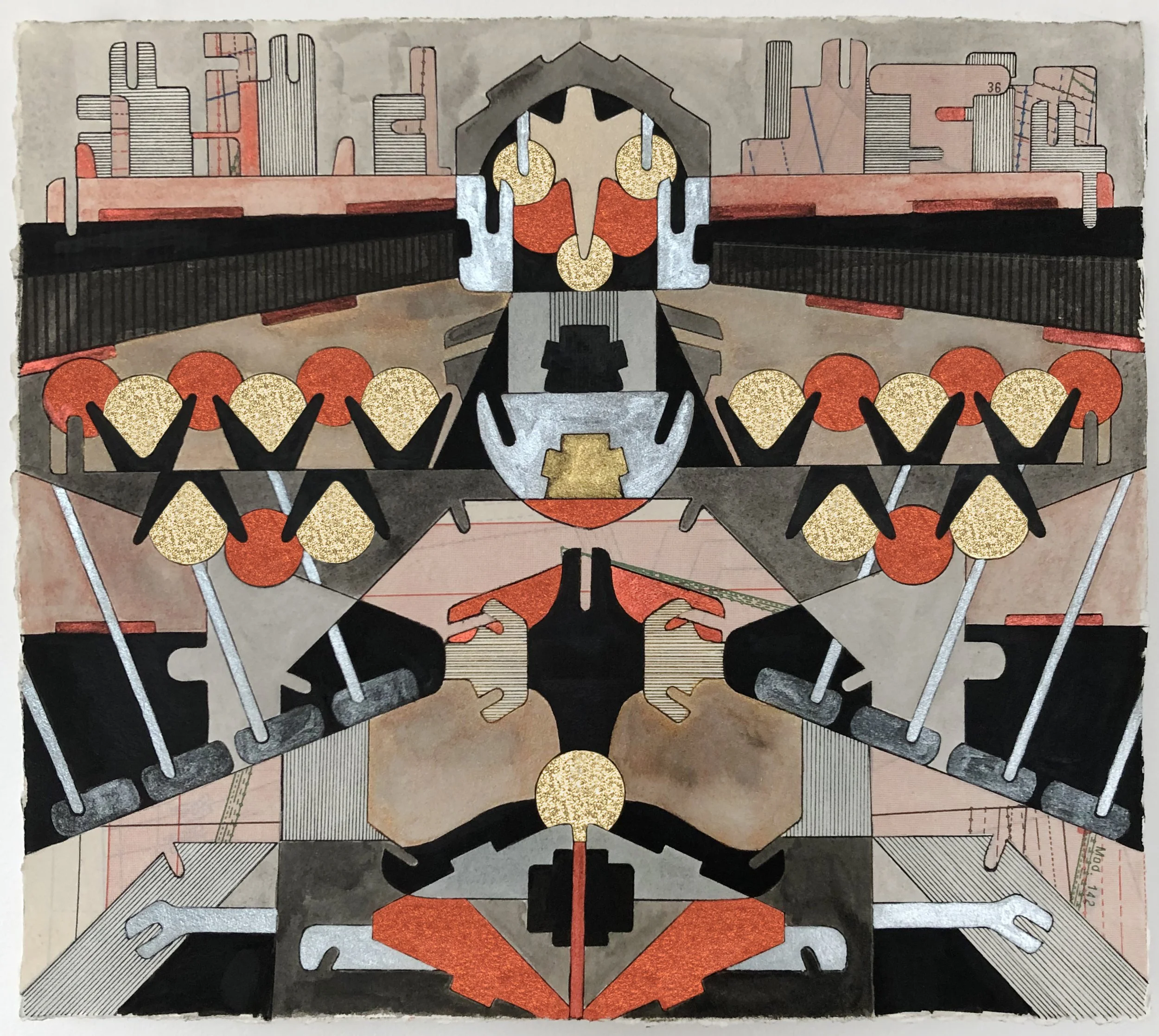 Linda Ganjian, “Pious Pistons” 15”x18” (mixed media: ink, watercolor, origami paper, patternmaking paper, giclee on paper)