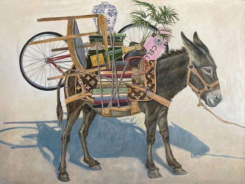 After a few years of Covid lockdown these paintings bring to mind a world without humans, in which the animals have taken ownership of the things that we value—and possibly our charactoristics as well. These situations could be looked at as stand-ins for society in an ambiguous relationship with nature that is absurd—and yet peculiarly comfortable. In these contemporary surrealist paintings, Broadbent positions animals amongst high design elements, dislocating them from their native habitats