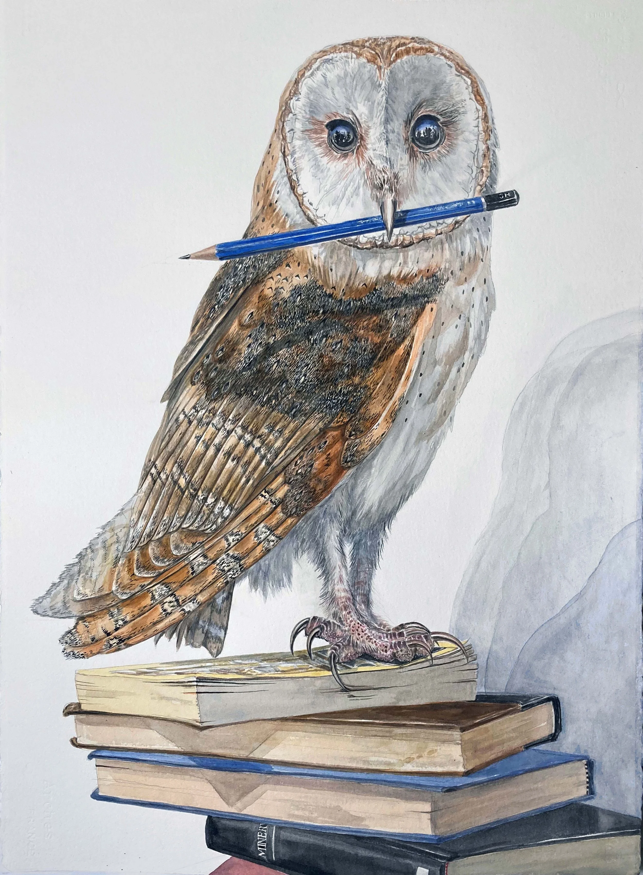 Broadbent’s watercolor painting, “Minerva” is rendered sensitively with a naturalist’s eye for detail. A snowy owl alights on a towering stack of books with a pencil in its beak. Gazing at the viewer, a reflection of the forest can be seen in its eyes. This emotive painting convey’s the animal’s wistfulness to return the forest as it stands amongst products created from trees. Minerva is the Roman goddess of wisdom, justice, law, victory, and the sponsor of arts, trade, and strategy. She is often depicted with her sacred creature, an owl usually named as the "owl of Minerva”, which symbolised her association with wisdom and knowledge. These mythological references heighten the poignancy of this painting with a further reference to knowledge in reading and writing in the composed elements of books and a pencil.