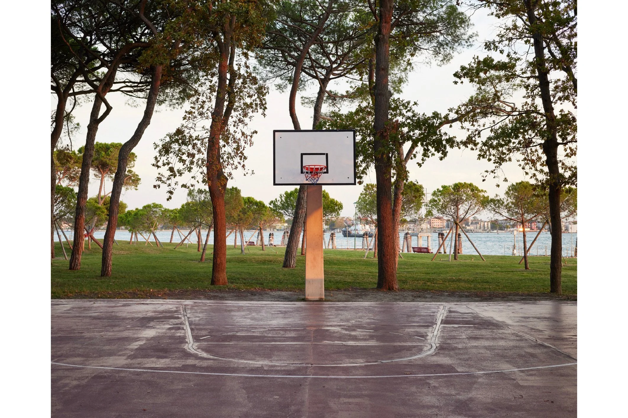The exhibition “HOOPS” features 24 photographs from the USA, The Netherlands, Iraq, Lebanon, Italy, Germany, Denmark, Palestine, Iceland, Mexico, Cyprus, France, China, Morocco and more. Some of the photos are of historically important locations to basketball, such as the backboard in Springfield, MA, the birthplace of basketball. In the photograph “Springfield College, Springfield, MA, USA 2023” a nondescript rectangular backboard stands stoically on a cracked, beat up blacktop surrounded by a wall of pine trees, their branches forming a natural enclosure that provides a stark contrast to the man-made structure. Other locations are in places not traditionally thought of to be havens for basketball.